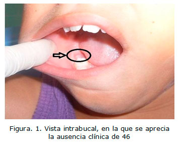 Paciente masculino, de 8 años de edad, con antecedentes de salud, que presentaba ausencia clínica de primer molar inferior derecho (46) desde hacía 2 años. No refiere hábitos deformantes, ni tampoco antecedentes patológicos familiares. Al examen físico intrabucal presentaba ausencia clínica del 46, cambio en la morfología de la mucosa bucal correspondiente al reborde alveolar en la región molar inferior derecha y engrosamiento de las láminas corticales óseas a ese nivel. También presentaba consistencia duro pétrea, no doloroso a la palpación. (Figura 1)