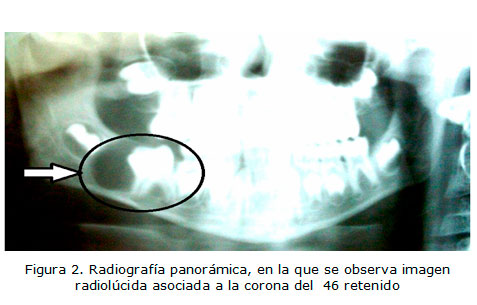 Al estudio radiológico panorámico presentaba una imagen radiolúcida asociada a la corona del 46 (Figura 2). La imagen radiolúcida muestra una lesión redondeada, de 2cm de diámetro; de aspecto unilocular, de bordes bien definidos; la cual evidencia la presencia de lisis ósea debido al crecimiento centrífugo y expansivo de la lesión quística.
