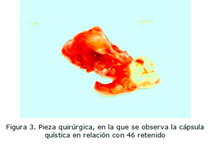 A través de la pieza quirúrgica analizada en el servicio de Anatomía Patológica de la Institución se determinó el diagnóstico concluyente de quiste dentígero en relación al 46. (Figura 3)