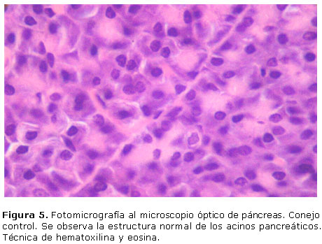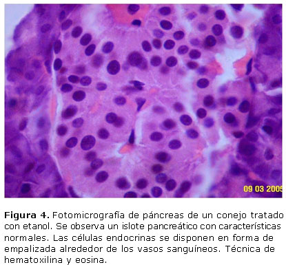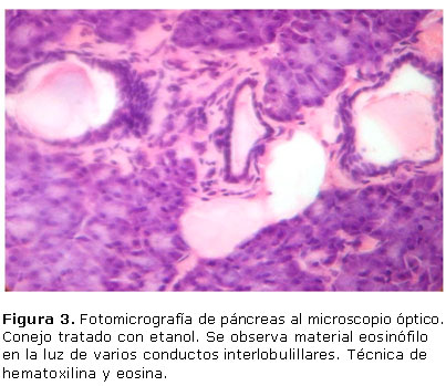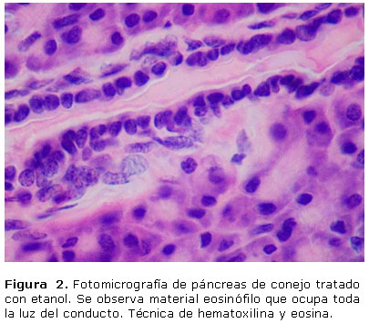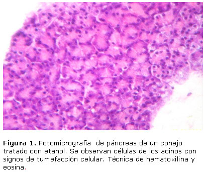 En los animales del grupo tratado con etanol y en el momento de la eutanasia se observó como dato macroscópico importante que el tejido pancreático de los conejos fue muy escaso y disperso. El estudio histológico reveló en estos conejos presencia de signos de tumefacción celular de las células parenquimatosas acinares en algunas zonas del tejido, contrastando con otras aparentemente normales. (Figura 1).