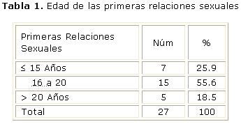 Como se observa en la Tabla 1, 81.5% de los casos tuvieron sus primeras relaciones sexuales antes de los 20 años.
