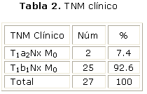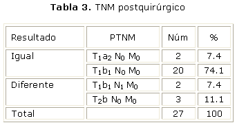 La Tabla 3 expresa que 81.5% tuvo igual clasificación en relación con el TNM clínico, luego de analizar la pieza quirúrgica. Solo en 5 casos (18.5%) fue diferente, que fueron clasificados originalmente como T1b1NxM0 y lo mismo sucedió con la evaluación postquirúrgica de la etapa clínica.