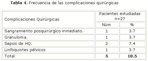 El 18.5% de los casos del presente estudio tuvo alguna morbilidad quirúrgica. No se presentó morbilidad, según se expresa en la Tabla 4.