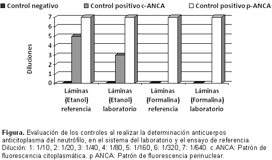 En la titulación (máxima dilución a la que se observó fluorescencia) de los controles del laboratorio en el ensayo de referencia (Figura), se observó que el control negativo se mantuvo de esta forma a todas las diluciones, el control positivo de cANCA tuvo un título 1/160 y el control positivo de pANCA presentó un título de 1/640, lo cual demuestra que los controles obtenidos en el laboratorio son adecuados, según lo reportado en la literatura.18