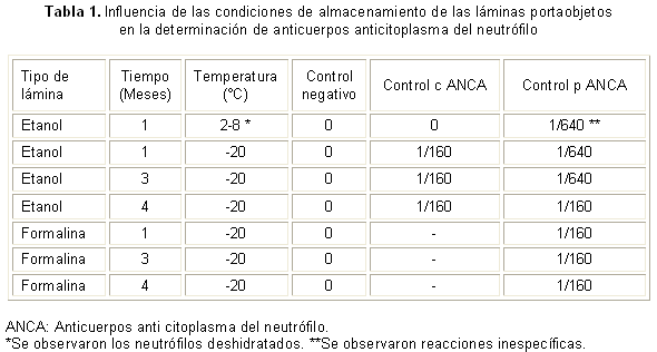 Como se observa en la Tabla 1, en las láminas conservadas por 1 mes de 2-8 °C, el control positivo cANCA no presentó fluorescencia y aunque el control positivo pANCA mantuvo su título, se observaron reacciones inespecíficas. Sin embargo, en las láminas conservadas a -20°C, se obtuvieron resultados adecuados. 18 El control negativo no mostró fluorescencia en láminas incubadas a diferentes tiempos. El control positivo cANCA mostró un título de 1/160 en todos los tiempos de conservación, el control pANCA disminuyó el título a medida que aumentó el tiempo de conservación en las láminas con neutrófilos fijados en etanol. En las láminas con neutrófilos fijados en formalina, no varió la fluorescencia de los controles con el tiempo de conservación. El tiempo óptimo de conservación del soporte con el sustrato es de 3 meses, ya que con este tiempo se alcanza la mayor fluorescencia de los controles.