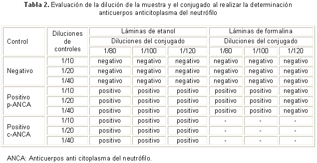 La dilución óptima de trabajo del conjugado fue de 1/100 y de los controles 1/20 (Tabla 2), lo cual coincide con lo reportado en la literatura para la determinación de ANCA. 3, 4,5