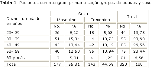 La distribución de pacientes con pterigium primario por grupos de edades y sexo se muestra en la Tabla 1. Como se observa, 55,31% de la serie eran hombres con predominio del grupo etario entre 30 y 39 años (29,69%). De forma general, fueron mayoritarios los hombres en edad laboral.