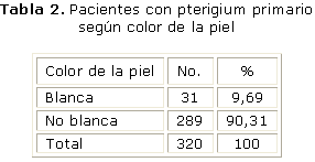 En la Tabla 2 se presenta la frecuencia de afectación en relación con el color de la piel, con franco predominio de pacientes de piel no blanca (90,31%).