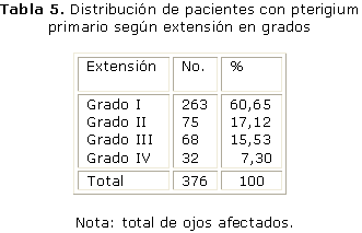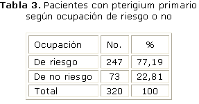 El grupo de edades comprendido entre 30 y 49 años fue el más afectado. Predominaron el sexo masculino, la piel mestiza, las ocupaciones consideradas de riesgo, el pterigium sintomático y los síntomas de enrojecimiento, sensación de cuerpo extraño y ardor. La mayor afectación fue unilateral, del ojo derecho y la localización nasal. El pterigium primario grado I fue el más encontrado, seguido de los grados II y III.