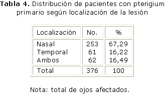 Cabe señalar el franco predominio de los casos con afectación nasal, aún cuando esta región supuestamente está más protegida por el tabique nasal de las radiaciones solares, el polvo y la sequedad ambiental; lo contrario de lo que le ocurre a la región temporal que se encuentra expuesta en mayor medida. Benítez, et al, explican este suceso por el recorrido del sudor desde la región frontal hacia la zona del tabique nasal y su introducción en la hendidura interpalpebral por la región nasal, que trae como consecuencia una serie de cambios bioquímicos e histológicos que favorecen la aparición del pterigium.23