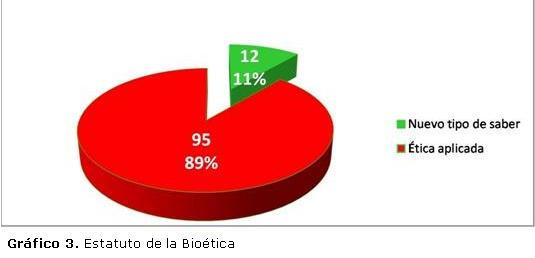 En el Gráfico 3, se muestra el criterio de los autores de los 107 trabajos que se decantaron por una fundamentación bioética sobre la cuestión del estatuto de la disciplina. En 95 trabajos (89%) se consideró la Bioética como una Ética aplicada, mientras que los 12 restantes (11%) la clasificaron como un nuevo tipo de saber de integración con un estatuto epistemológico.