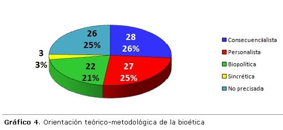 Sin embargo, otro aspecto no menos importante a tener en cuenta, más que la divulgación misma, es la profundidad de análisis y la orientación teórico-metodológica de las reflexiones bioéticas contenidas en esos trabajos. Llama la atención que 30,9% de estas contribuciones se sustentaban en una fundamentación consecuencialista utilitarista, tendencia que no ha sido la de mayor desarrollo de los autores nacionales con reconocida obra en el campo de la Bioética, entre los que predominan las tendencias personalistas y ambientalista biopolítica. En este trabajo se adopta una acepción sobre el término biopolítica diferente al de autores como Michel Foucault que la entienden como el uso del conocimiento biológico con el fin de servir de instrumento a un biopoder oligárquico, sino que aquí se asume como el uso del conocimiento biológico para el diseño de políticas públicas saludables democráticamente concertadas en un espacio social verdaderamente participativo.