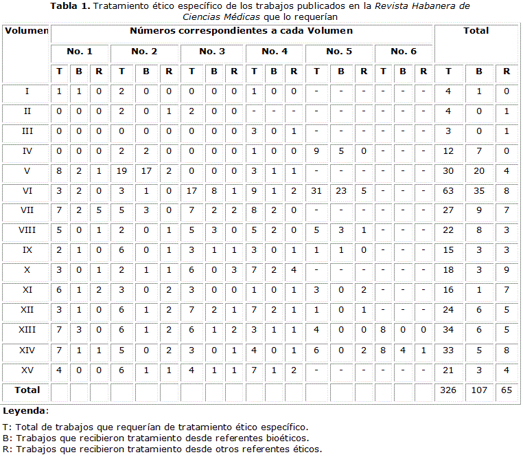 La RHCM ha mantenido la presencia de temas bioéticos en sus páginas durante sus 15 años de existencia. Después de un incremento inusitado circunstancial con motivo de la publicación de las memorias de eventos dedicados a la disciplina ocurridos entre 2006 y 2007, ha logrado estabilizar un colchón editorial que le permite la publicación sistemática de trabajos dedicados a tratar asuntos en los que se involucran y hasta colisionan valores morales. El hecho de que una elevada proporción de estos trabajos, 154 de 326 (47,2%), no hayan recibido ningún tipo de tratamiento ético es reflejo de la falta de percepción de sus autores de esta necesidad, pero también del equipo de arbitraje por no alertarlos al respecto durante el trabajo de revisión. Pudiera aducirse que tanto investigadores como árbitros pueden carecer de la debida formación en ética, o más específicamente en Bioética, y esa en esencia parece ser la razón; sin embargo, otros elementos que analizaremos en su momento hacen pensar que esta situación no es tan crítica hoy como lo era cuando la revista vio la luz por primera vez hace tres lustros.
