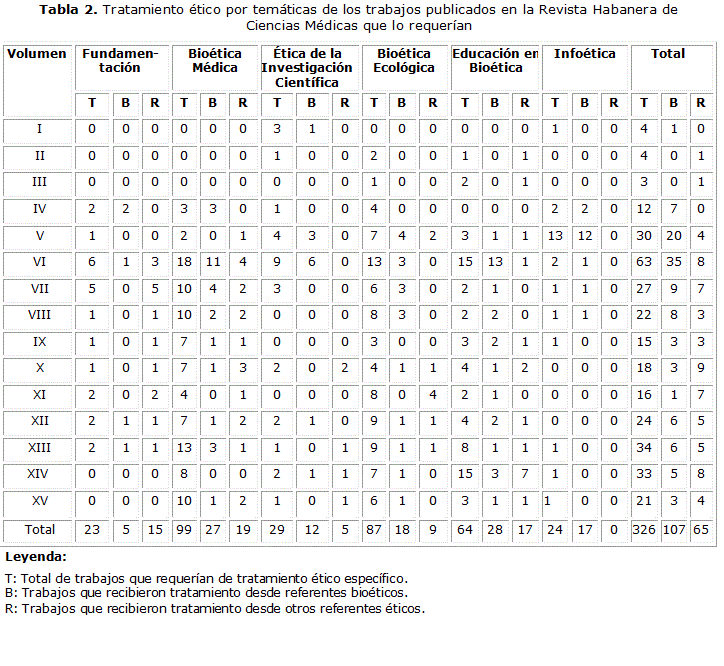 En la Tabla 2, se consigna el tratamiento ético recibido por los artículos según su temática. Se puede observar que lógicamente son los trabajos sobre fundamentación ético-filosófica los que reciben mayor atención con 20 (86,9%) de un total de 23. Sin embargo, en su mayoría (15), este tratamiento no se realizó desde la Bioética, sino desde otros referentes éticos.