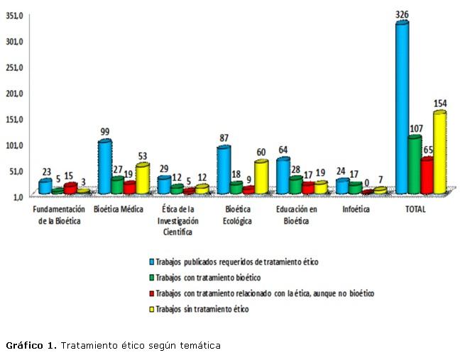 En el Gráfico 1, se resalta que el déficit de tratamiento ético en los temas de Bioética médica y Bioética ecológica es tan agudo que resulta determinante para que la proporción general de trabajos sin tratamiento ético sea tan significativa, 154 (47,2%).