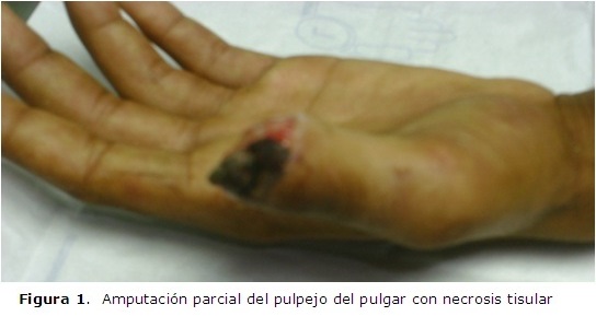 Paciente masculino, de 25 años de edad, mototaxista de profesión, que sufre lesión del pulgar izquierdo al intentar colocar la cadena de transmisión de la moto con el motor encendido, presenta amputación parcial del pulpejo del dedo pulgar de la mano izquierda. (Figura1).