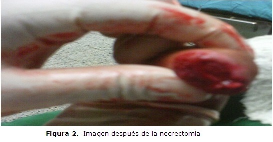 El extremo del pulpejo evoluciona hacia la necrosis y es atendido en el Centro de Diagnóstico Integral (CDI) "Concepción" del Municipio la Cañada de Urdaneta, Estado Zulia, Venezuela. Después de 9 días se decide retirar el tejido necrosado (Figura2) y se realiza colgajo pediculado fasciocutáneo de base proximal en el lado medial y superior de la región pectoral derecha de aproximadamente 2 cm de ancho por 2 cm de largo (Figura3).