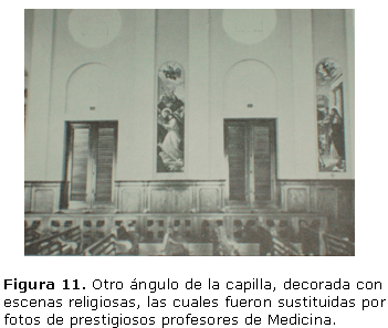 Originalmente la capilla estaba decorada con escenas del Vía Crucis en los intercolumnios, así como un gran mural detrás del Altar Mayor, los cuales fueron sustituidos por retratos de insignes profesores de Medicina acorde con el carácter del Aula Magna (Figuras 10 y 11).