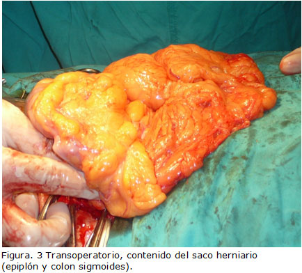 Resumen evolutivo: Durante el acto quirúrgico se encontró gran parte del epiplón mayor y colon sigmoides dentro del saco herniario realizando resección de un segmento de epiplón, reintroduciéndose sin dificultad hacia la cavidad abdominal el resto de epiplón y el colon sigmoides. Se comprobó que el paciente es portador de una hernia inguinal derecha de menos magnitud la cual se decidió resolver en una segunda intervención. El paciente tuvo una recuperación pos-operatoria muy favorable con mejoría casi total de su sintomatología. Figuras 1, 2 y 3.