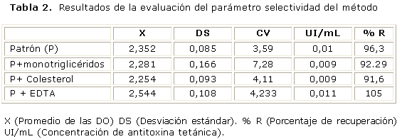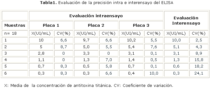 La alta precisión y exactitud alcanzada en la estandarización validan al ELISA, adecuado para evaluar la respuesta de anticuerpos contra el Toxoide tetánico y puede ser especialmente útil en estudios seroepidemiológico y la evaluación de la respuesta inmunitaria humoral.
