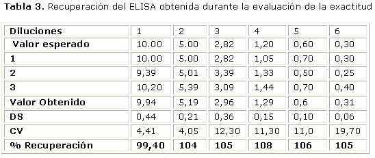 Se obtuvo en todos los casos una imprecisión intraensayo menor de 10 % (Tabla1). En la prueba de precisión interensayo predominaron coeficientes de variación menores de 20 % en la mayor parte de los ensayos. 11, 12, 13,14