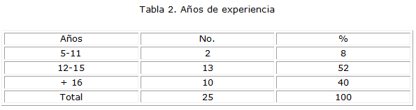 El promedio de edad fue de 38 años con una desviación estándar de 5,3; 72 % del personal fueron enfermeras Licenciadas y 52% tenía una antigüedad de 11 a 15 años. (Tabla 1 y 2).