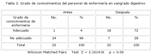 En lo referente al grado de conocimientos del personal de enfermería en afecciones digestivas que conlleva al sangrado digestivo, antes de la intervención educativa, 96% obtuvo No adecuado, no siendo así después de la intervención educativa, que arrojó 72% como Adecuado. (Tabla 3). La comparación entre los resultados de antes y después fue significativamente diferente con una P<0.05, de acuerdo con la prueba de rangos con signos de Wilcoxon.