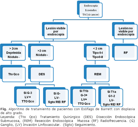 Pacientes con displasia de alto grado: La esofagectomía constituye la única opción clara que puede erradicar totalmente este tipo de lesión, pero las tasas elevadas de morbilidad y mortalidad desaconsejan su uso. El tratamiento endoscópico constituye una alternativa (Radiofrecuencia, Terapia Fotodinámica o Resección endoscópica mucosa) en combinación con seguimiento endoscópico en 3 meses. Existen particularidades en pacientes tales como la edad avanzada o con co-morbilidades en las que no se recomienda tratamiento quirúrgico. En los casos donde la displasia de alto grado esté sobre un segmento largo se aconseja la opción quirúrgica. La experiencia del servicio y la extensión de la lesión en las capas del esófago determinarán cada variante.
