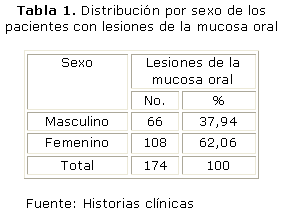 La Tabla 1 presenta la distribución de pacientes con tratamiento de ortodoncia que presentaron lesiones de la mucosa oral. Se observó un predominio del sexo femenino con un 62,06 %.