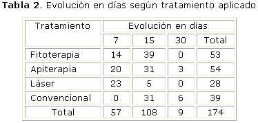 La totalidad de los pacientes tratados con Láser terapia y Fitoterapia tuvieron una evolución final satisfactoria en un término de 15 días, sin embargo algunos de los tratados con apiterapia y la técnica convencional demoraron hasta 30 días en su curación.