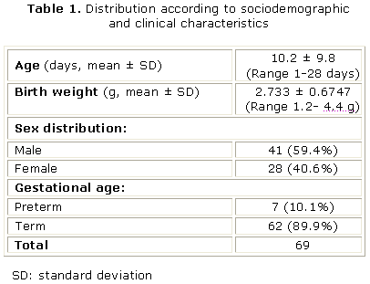 Table 1 shows the distribution of neonates with CHD by age, birth weight, sex, and gestational age. The results indicated that the mean age of the newborns was 10.2 ± 9.8 days (range 1-28 days). Seven patients (10.1%) had gestational ages less than 37 completed weeks (preterm). It also shows that males were predominant (59.4%).