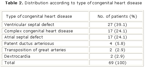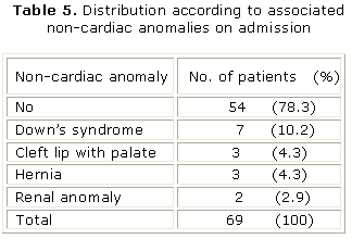 Table 5 shows associated non-cardiac anomalies which were present in 15 patients with CHD (21.7%). Down's syndrome was noticed in the higher proportion (10.1%).