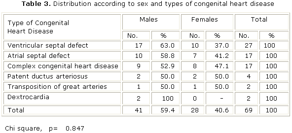 Data were tabulated and statistically analyzed using the appropriate statistical tests through SPSS software package version 1.5. The chi square test, with a significance level of 5% (p<0.05), was used to determine the possible relationship between the type of congenital heart disease and sex.