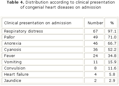 Table 4 shows that among the different clinical manifestations of CHD, the commonest were respiratory distress (97.1 %), pallor (71.0%), anorexia (66.7%), cyanosis (52.2%) and fever (34.8%).