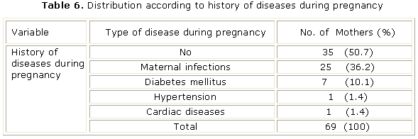 Maternal disease like maternal infection, diabetes mellitus and hypertension might increase occurrence of heart disease in neonates. Regarding the history of diseases during pregnancy, in this study it was found that 50.7% of mothers of affected neonates had no history of disease during pregnancy period, while 36.2% of mothers gave a positive history suggestive of infection during their pregnancy period, 10.1% mothers were diabetic, 1.4% hypertensive and 1.4% had cardiac diseases (Table 6). This was similar to a study in Bangladesh which revealed that 78% of mothers had no history of disease during pregnancy period, while 10% of mothers were diabetic but there were no similarity in 8% hypertensive and 4% mother's infection during their pregnancy period.5 Another study in Egypt showed that 8.27% of them were exposed to febrile illness. Jupta mentioned that maternal febrile illness during first trimester of pregnancy may be associated with increased risk of certain CHD that may reach two folds. 22