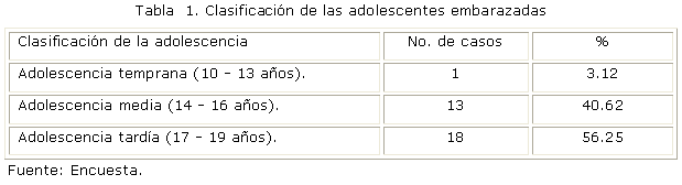 Teniendo en cuenta que el embarazo en la adolescencia se define por el período de gestación que transcurre entre los límites de edad de 10 a 19 años, el universo estuvo formado por 41 mujeres entre estos grupos de edades, las que fueron vistas en consulta o terreno en el Área de Salud Nuevo Turumo. La muestra intencional estuvo constituida por 32 pacientes.