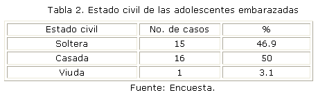 Otros autores, como Molinero, 4 expresan que la mayoría de las adolescentes embarazadas son solteras, lo cual no coincide con la muestra estudiada dado que poco menos de la mitad tenía esta condición frente a 50% de casadas. El criterio de las autoras respecto a estas diferencias en los resultados es que el ser una adolescente soltera no constituye por sí solo un factor de riesgo predisponerte de embarazo. Al respecto, Alarcón y Rojas 5 expresan que el matrimonio precoz es una variable determinante de la fecundidad, pues aumenta el número de años de exposición al riesgo de concebir y con lo cual las autoras están parcialmente de acuerdo.
