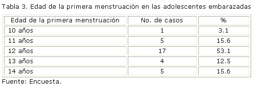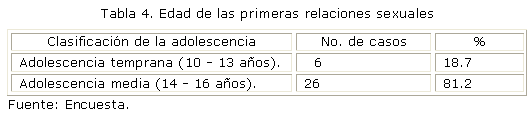 Los resultados obtenidos en cuanto a la escolaridad muestran que la secundaria terminada y sin terminar presentaron igual número de casos para 50% en ambos. En estudios como los de Reyes,3 el grado de escolaridad predominante fue la secundaria básica así como en los realizados por Mirabal, Martínez y Pérez.6 El 53.1% (17) tuvo la menarquia a los 12 años (Tabla 3) de edad teniendo las primeras relaciones sexuales 81.2 %(26) (Tabla 4) en la adolescencia media. No se encontraron otros estudios, en los que se reflejara otro grado de escolaridad.