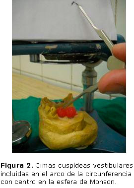 El punto donde coincidieron los dos arcos representó el centro de la esfera de Monson y el punto de partida para el encerado de la cúspide en el sector inferior. Auxiliándonos del compás durante este proceso, se tuvo la precaución de que las cimas cuspídeas vestibulares de todos los dientes posteroinferiores estuvieran incluidas en el arco de la circunferencia cuyo centro se determinó previamente, lo cual permitió restaurar la Curva de Spee (Figura 2).