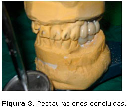 Finalizada esta etapa de laboratorio, se realizó la prueba de las coronas enceradas en la clínica, donde se valoró la estética y la oclusión en la posición de oclusión céntrica y durante las excursiones mandibulares, principalmente la propulsión, pues es donde se hace evidente la funcionalidad de la Curva de Spee. Solamente fue necesario realizar ajustes menores.
